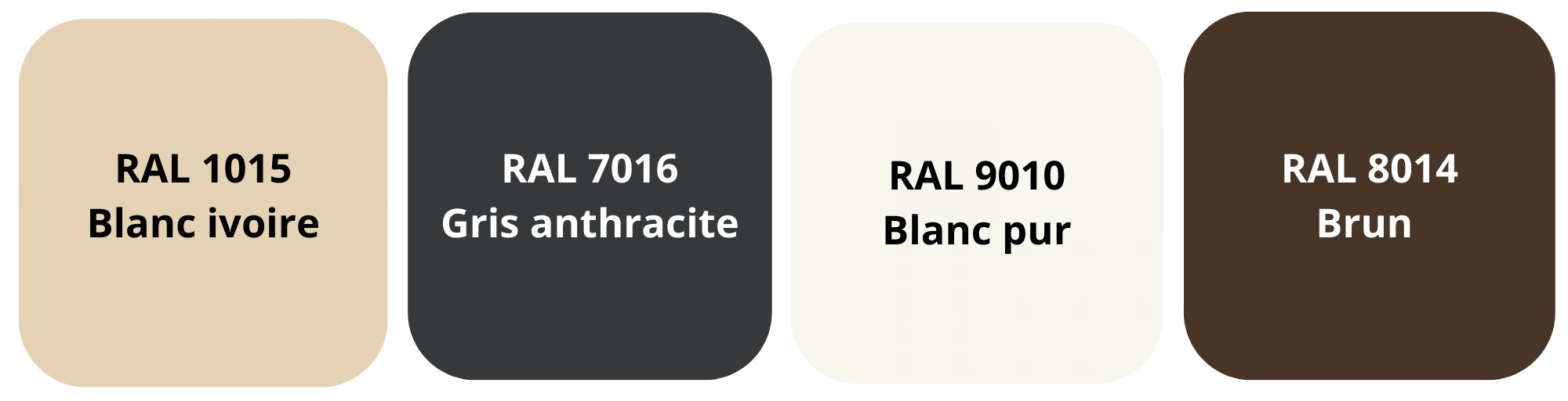 Qu'il s'agisse de nos produits principaux ou de nos accessoires, nous proposons à la commande 4 RAL en aluminium :