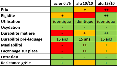 L’aluminium 15/10e est plus épais, et donc plus rigide que l’aluminium 10/10e. L’aluminium 15/10e pourra donc supporter des poids plus conséquents. Par exemple, pour la pose de poteaux, clôtures au dessus de couvertine... il sera plus résistant aux chocs et aux intempéries, comme la grêle.