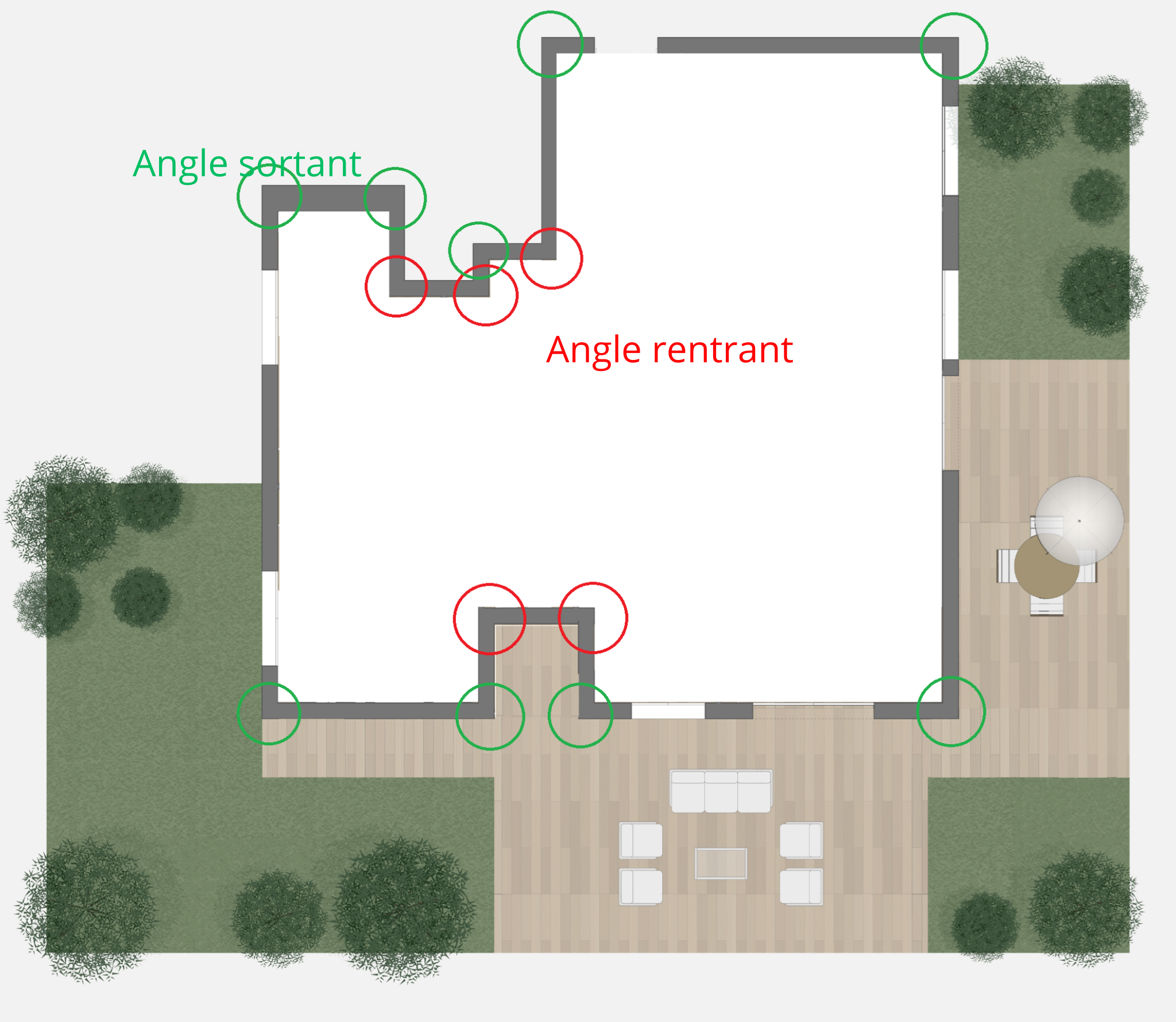 Exemple : Un angle de 90° vers l’intérieur d’un patio ou d’une cour.