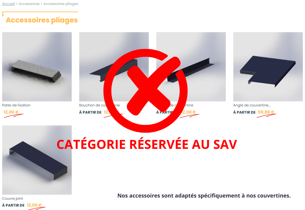 La catégorie ACCESSOIRES PLIAGES est réservée au SAV. Cette catégorie est mise en place en cas d'oubli d'un de vos accessoire lors de votre commande.