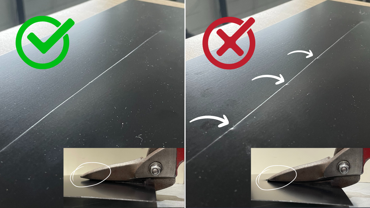 Si votre découpe nécessite plusieurs coups de cisaille, terminer la coupe avec la butée de celle-ci pour éviter de marquer la tôle.